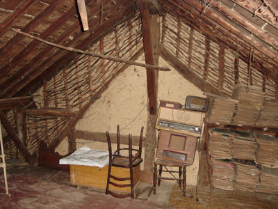 Le grenier... avec son vrai mur en torchi. Il est également bon de noter que le toit a l'âge de la maison... fait de "pierre-ardoise", de terre et de clous forgés.