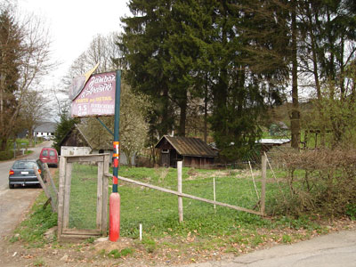 Enfin, le terrain situé en face de la maison. Au bout de se terrain, un gros garage (le truc blanc avec un toit brun...). Derrière le terrain et le garage coule un joli ruisseau.
