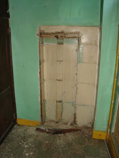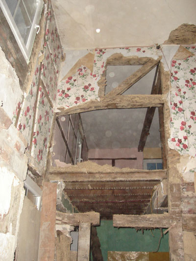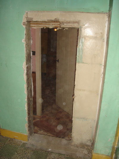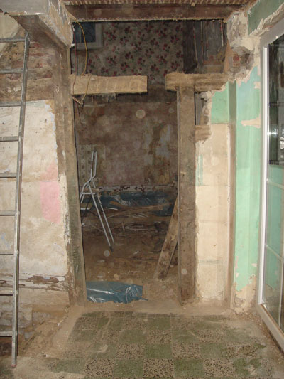 Début 2008, lors de la pose des poutres, on a donné un grand coup. L'idée étant de rendre à la porte sa taille d'origine (et en tous cas un moyen de passage pour Anne ou moi), on a attaqué le colombage, mais de façon délicate (quand même). Trois coups de tronçonneuse plus tard, quelques coups de masses et encore l'un ou l'autre clous, c'est devenu présentable.